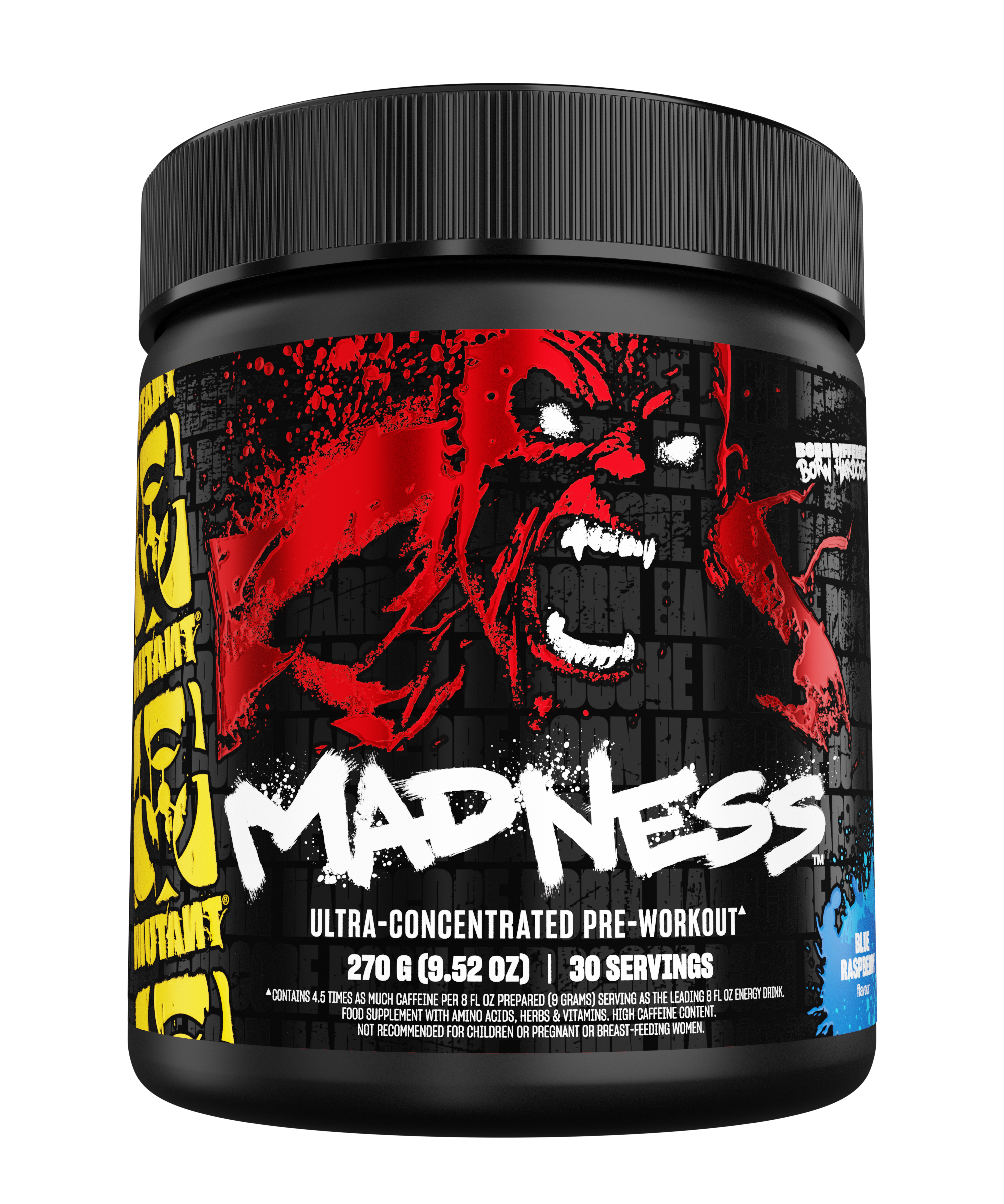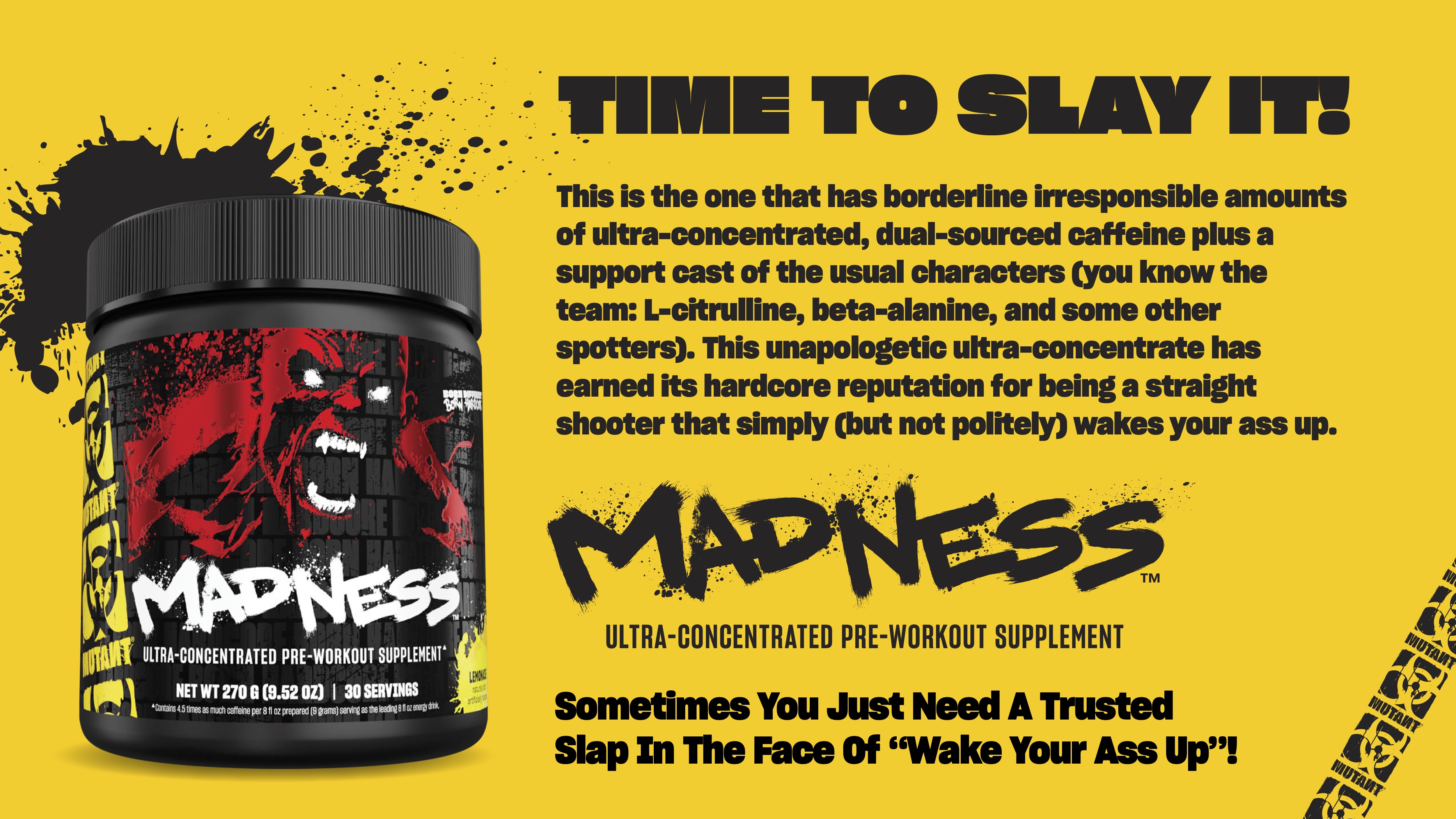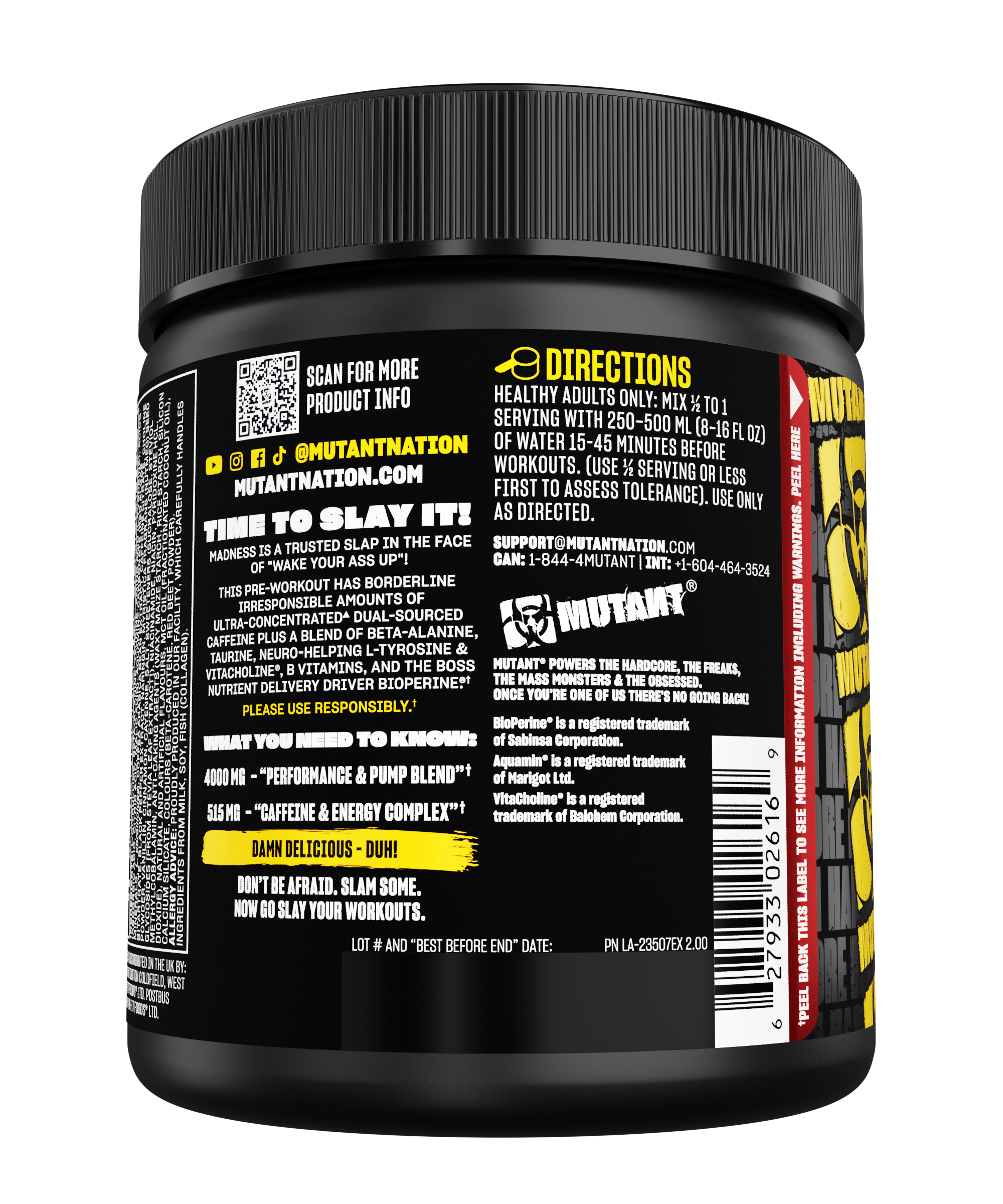 TIME TO SLAY IT. Madness is a trusted slap in the face of “wake your ass up”! This pre-workout has borderline irresponsible amounts of ultra-concentrated▲ dual-sourced caffeine plus a blend of L-Citrulline Beta-Alanine, Taurine, neuro-helping L-Tyrosine & Vitacholine®, B Vitamins, and the boss nutrient delivery driver BioPerine®.† From the PERFORMANCE & PUMP BLEND to the CAFFEINE & ENERGY COMPLEX to the EXTRA VITAMINS AND ELECTROLYTES, your workouts will never be the same. These powerhouse ingredients ensure explosive energy to power through the most grueling workouts. Elevate your performance, conquer your limits, and achieve the gains you've always dreamed of with our ultimate pre-workout supplement. Dominate the iron, because greatness demands no less. BORDERLINE IRRESPONSIBLE AMOUNTS OF ULTRA-CONCENTRATED AWESOME. WHY WE CREATED MUTANT® MADNESS™ Building more muscle requires the intense stimuli of insane workouts. If you can’t push past your energy limitations you won’t stimulate more muscle growth. So we developed a pre-workout, SO F’ING INTENSE, WE HAD NO CHOICE BUT TO CALL IT “MADNESS™”. HOW DO I USE MUTANT MADNESS? Directions for healthy adults only: mix ½ to 1 serving with 8–16 fl oz (250–500 ml) of water 15-45 minutes before workouts. (use 1/2 serving or less first to assess tolerance). Use only as directed. Follow all the warnings on the label before use. Do not consume within 4 hours before bedtime. Never exceed two servings per 24 hours. CAN I STACK MUTANT MADNESS WITH OTHER MUTANT PRODUCTS? Absolutely! We highly recommend stacking MUTANT MADNESS with an amino acid powder such as MUTANT GEAAR or MUTANT HARDCORE BCAA. And it’s also a great idea to add a serving of creatine such as MUTANT CREAKONG. Stacking MADNESS with both products will help support the additional power and strength benefits you need during your workouts. CAN I TAKE MORE THAN THE RECOMMENDED SERVING SIZE? This is the part where we could joke around and be clever. But we won’t. Never consume more than the recommended directions for use on the label and never exceed 2 servings within a 24-hour period. Don’t even think about it. DOES MUTANT MADNESS HARDEN OR CLUMP LIKE ALMOST EVERY OTHER PRE-WORKOUT SUPPLEMENT? Many pre-workout powders are highly susceptible to clumping due to the nature of popular ingredients such as L-Citrulline, Beta-Alanine, and Taurine. Exposure to heat and humidity also contributes to clumping and hardening. MUTANT MADNESS is formulated to include tiny amounts of food-based ingredients, such as waxy maize and rice starch, to help keep the powder as dry and fluffy as possible and prevent it from hardening or clumping. In addition, always keep the lid on tight and keep your MUTANT MADNESS stored in a cool, dry place. TIP: Always shake your bottle of MUTANT MADNESS before using, especially if it hasn’t been opened for a while. This helps ensure all the ingredients are mixed evenly so that you get an accurate dose every time. Giving the powder a minute to settle down immediately after shaking it up is a good idea.