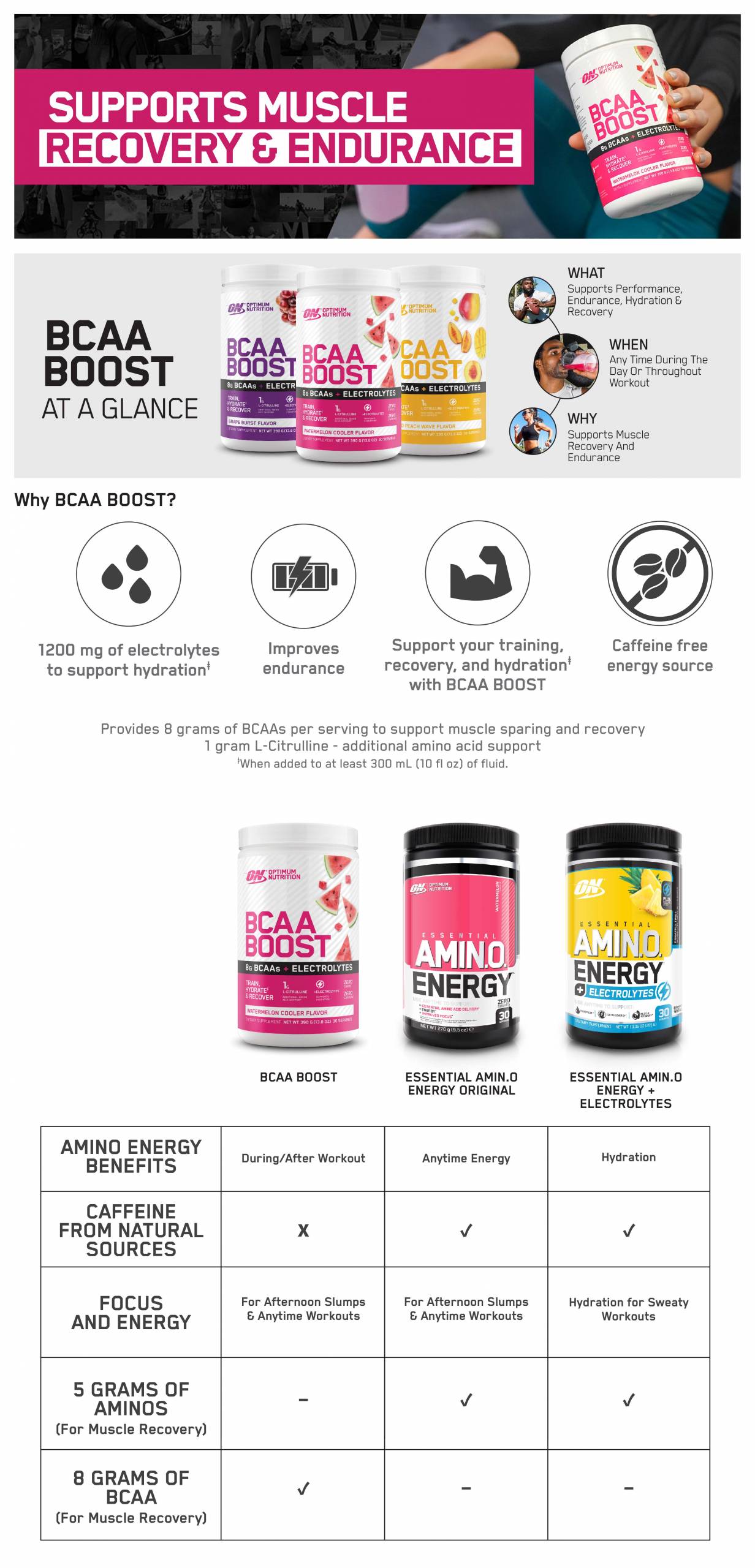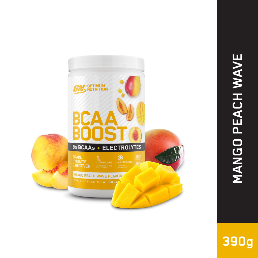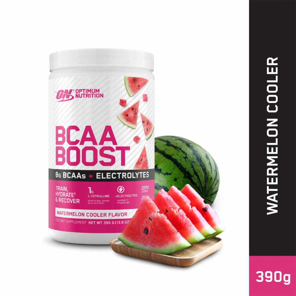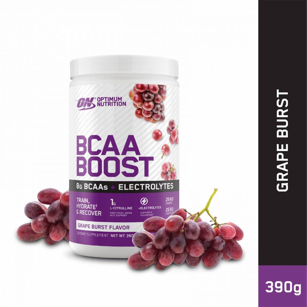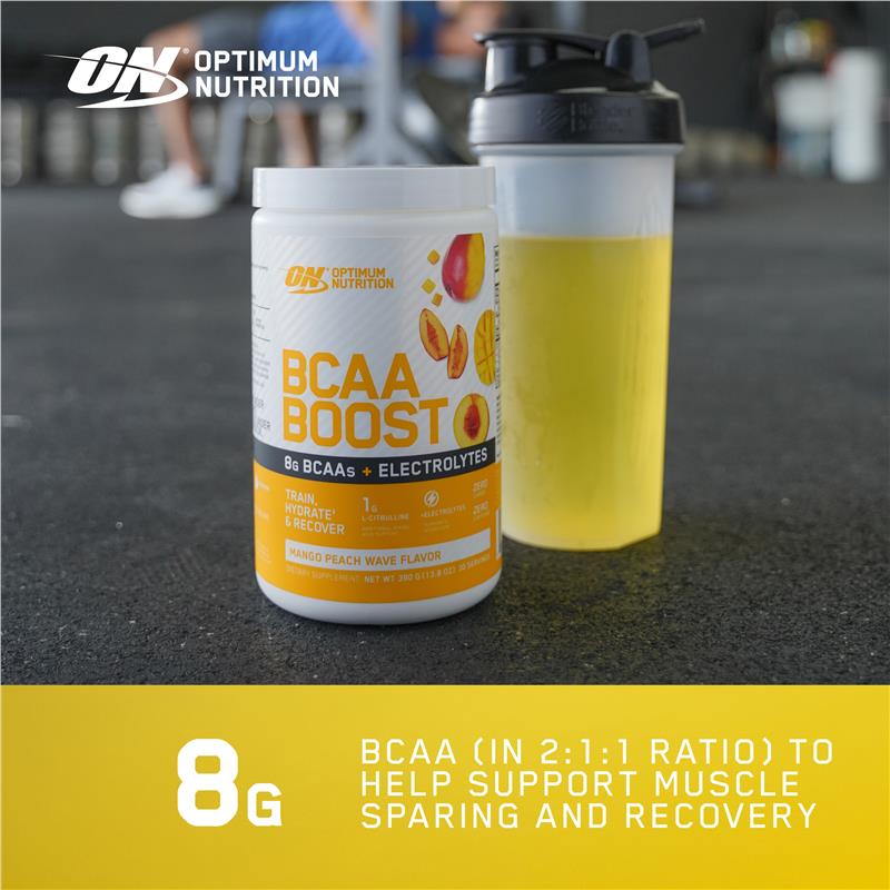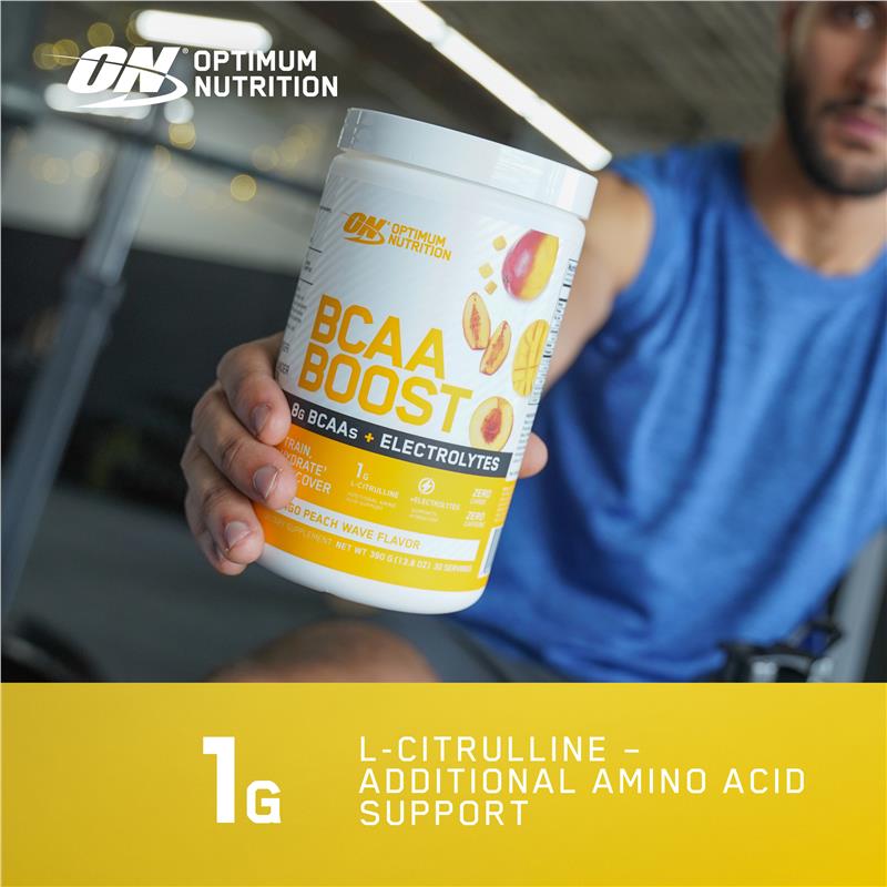 Description Introducing Optumum Nutition (ON) BCAA Boost. A flavoured BCAA drink containing the Amino Acid L-Citrulline & Electrolytes. BCAA Boost is ideal for intra-workout nutrition providing the nutrients to train, hydrate & recover. Available in a mouth watering range of flavours including grape burst, mango peach wave & watermelon cooler. Optimum Nutrition BCAA Boost features: • Provides 8 grams of BCAAs per serving to support muscle sparing and recovery • 1200mg of electrolytes to support hydration • Zero Carbs & Caffeine • 1 gram of L-Citrulline – additional amino acid support • Help support your training, recovery and hydration with BCAA Boost • Fantastic easy to drink flavours