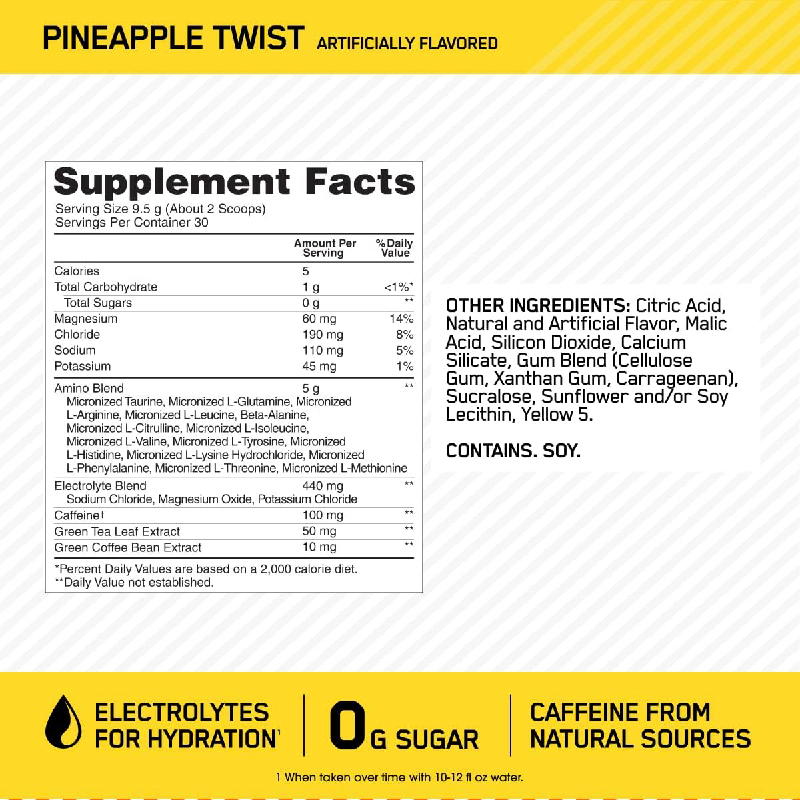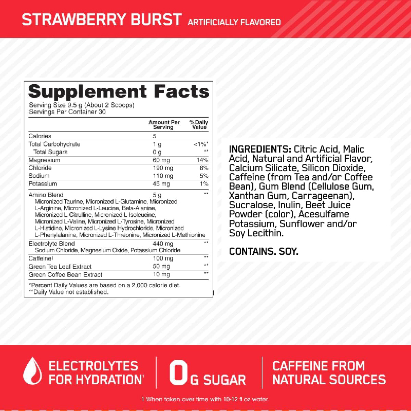 An Optimum Nutrition Product Use Anytime To Support: Hydration, Focus & Muscle Recovery* Contains 100mg of caffeine per serving Low in calories and carbohydrates Supports focus, energy, hydration, & muscle recovery Available in 4 all new refreshing fruity flavors