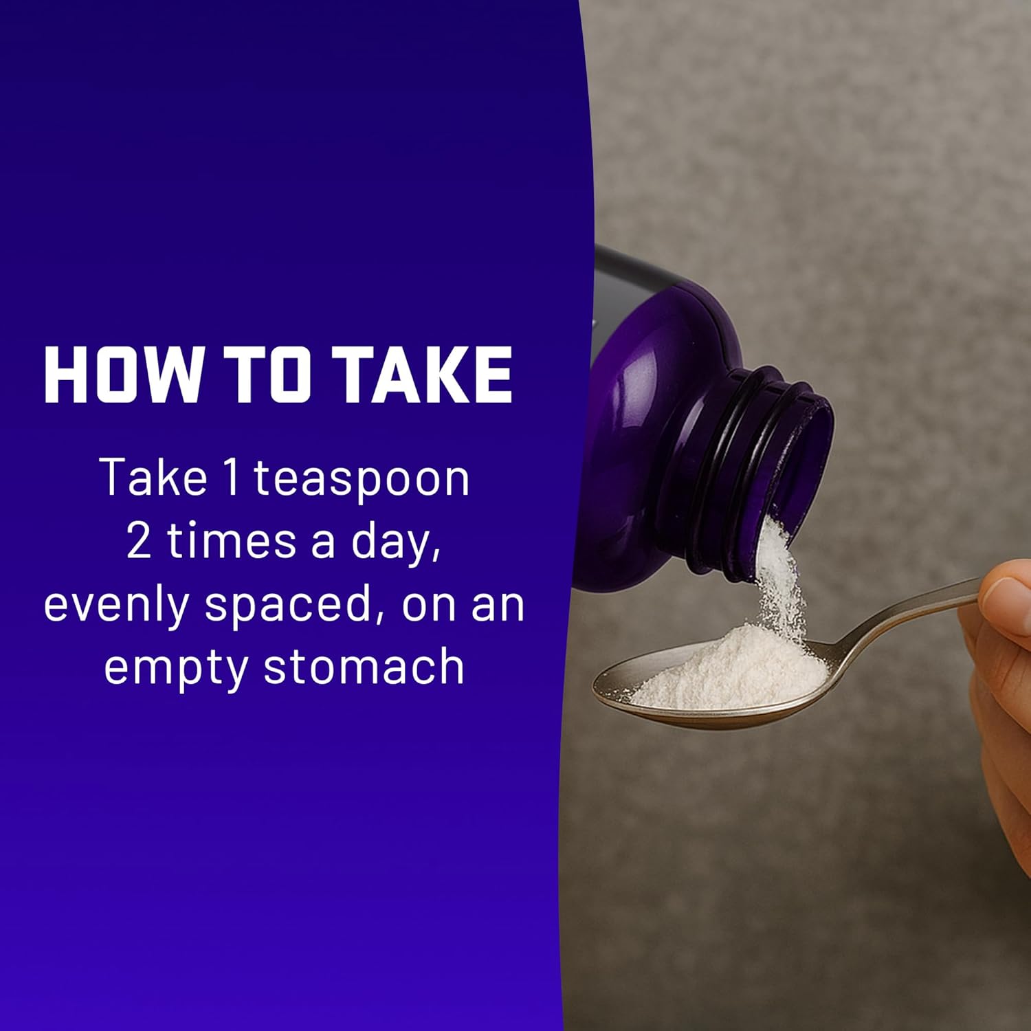 As a dietary supplement, take one rounded teaspoon (approximately 5 grams) two times a day, evenly spaced, on an empty stomach.