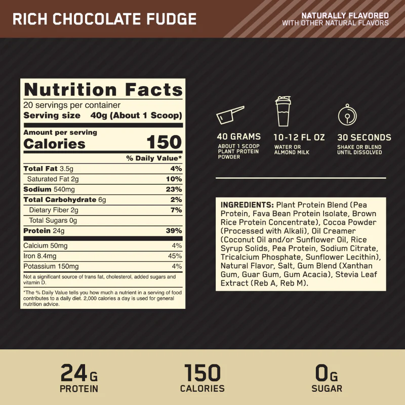 Choose from great-tasting Creamy Vanilla and Rich Chocolate Fudge flavors – each mixing into a silky-smooth shake with only a glass and spoon. With 0g sugar⁵ and no artificial colors, flavors, or sweeteners, GOLD STANDARD 100% Plant Protein is the only choice for anyone who demands the highest quality vegan nutrition supplements available¹.