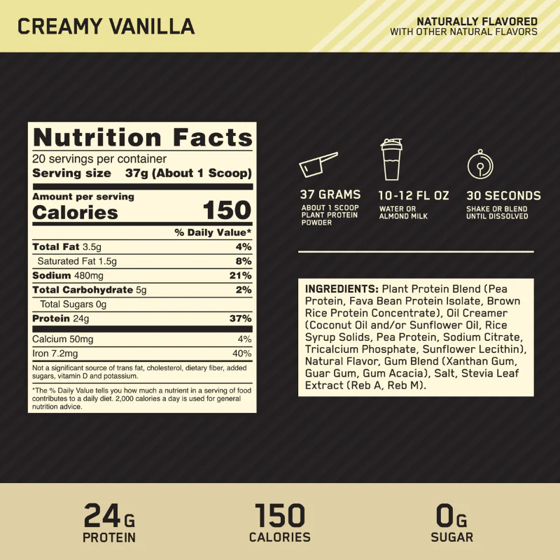 GOLD STANDARD 100% Plant Protein supports muscle with 24g of quality plant protein and 20 amino acids – including all 9 essential amino acids – all with the unparalleled GOLD STANDARD® taste, texture, and consistency you've come to expect only from OPTIMUM NUTRITION®¹.